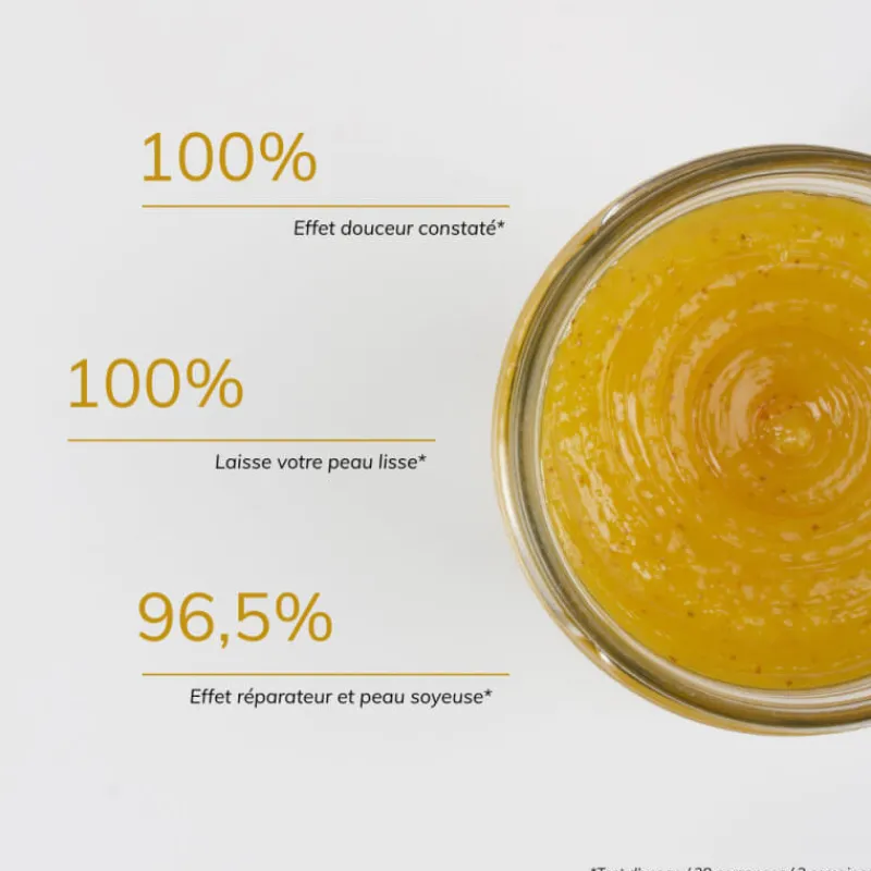 Bon exfoliant, exfoliation douce 100 %*Laisse la peau lisse 100 %*Laisse la peau douce 100 %*Effet réparateur et peau soyeuse 96,5 %*La peau est hydratée et apaisée 92,8 %**Test d’usage / 28 personnes / 2 semaines