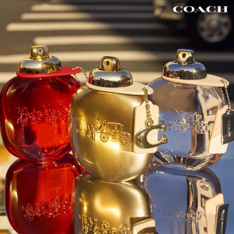 Paré de l’emblématique calèche Coach, l’étui en feuille d’or traduit le caractère précieux de ce nouveau Parfum.