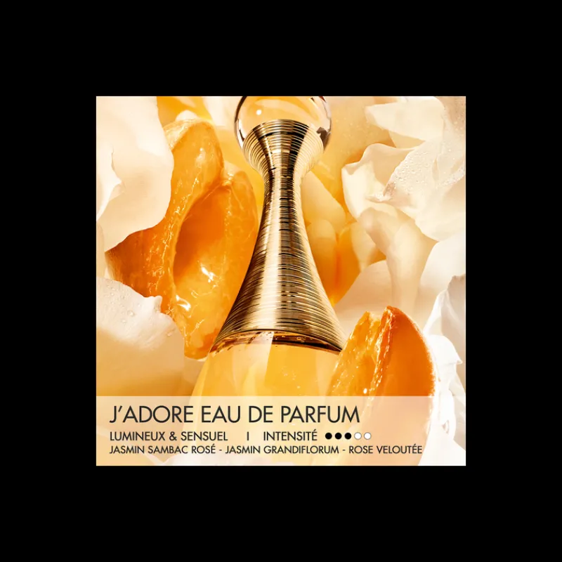 J’adore, le parfum pour femme de légende de la maison Dior, s’épanouit dans un arrangement floral de notes d’ylang-ylang, de rose damascena et de jasmins grandiflorum et sambac.