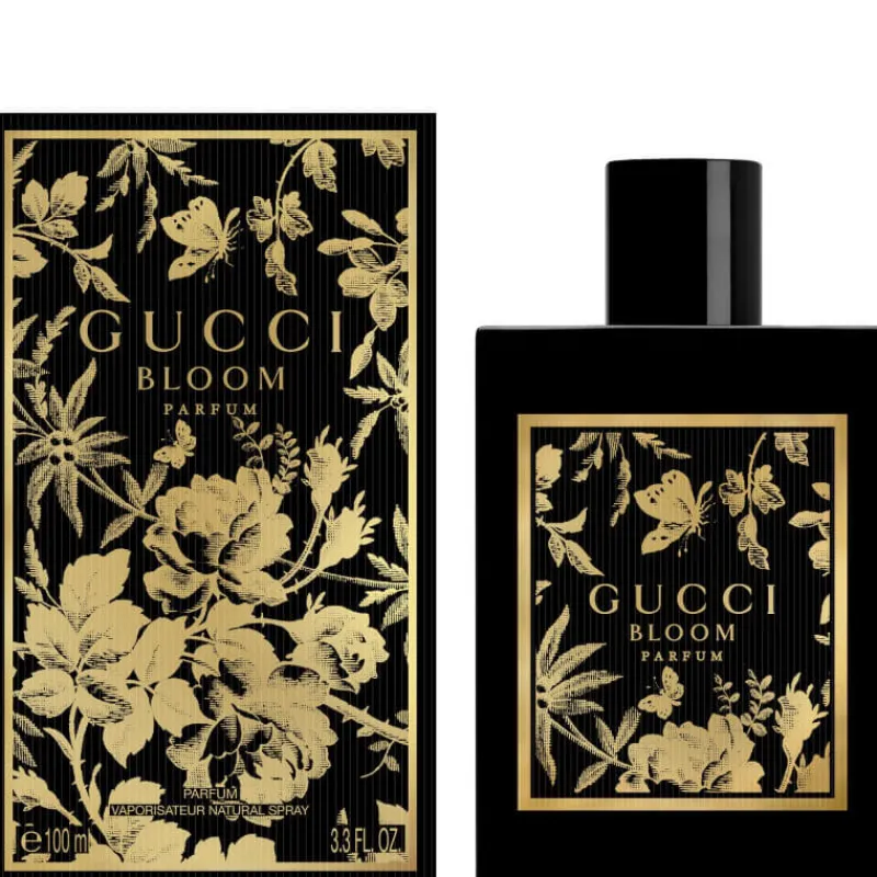 Le flacon se pare d’un remarquable noir intense qui fait écho à la profondeur et la puissance concentrées de l’élixir qu’il renferme. Des finitions dorées ornent l’emblématique motif de la Maison : feuillage, branches de cerisier, fleurs et papillons, évoquant une élégance lumineuse et chaleureuse. Portrait moderne d’une féminité en pleine éclosion, Gucci Bloom incarne un espace de découverte de soi, où la beauté s’épanouit et les femmes se célèbrent dans leur accomplissement.