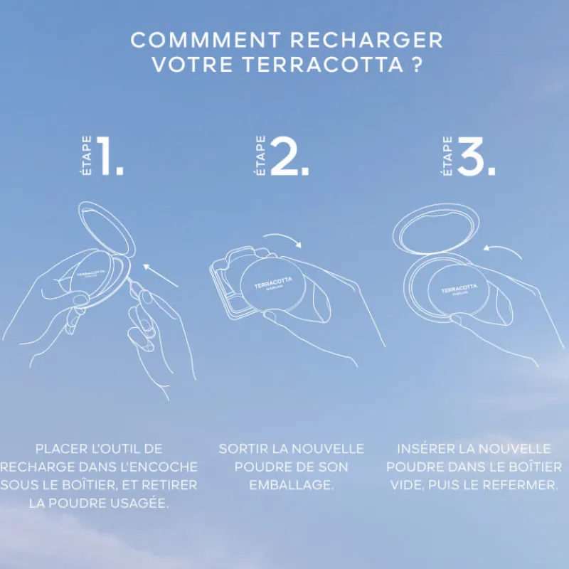 La poudre bonne mine ensoleillée Terracotta, formulée avec 96% d’ingrédients d’origine naturelle¹ et maintenant rechargeable offre une mine fraîche et éclatante au fini naturel inimitable.