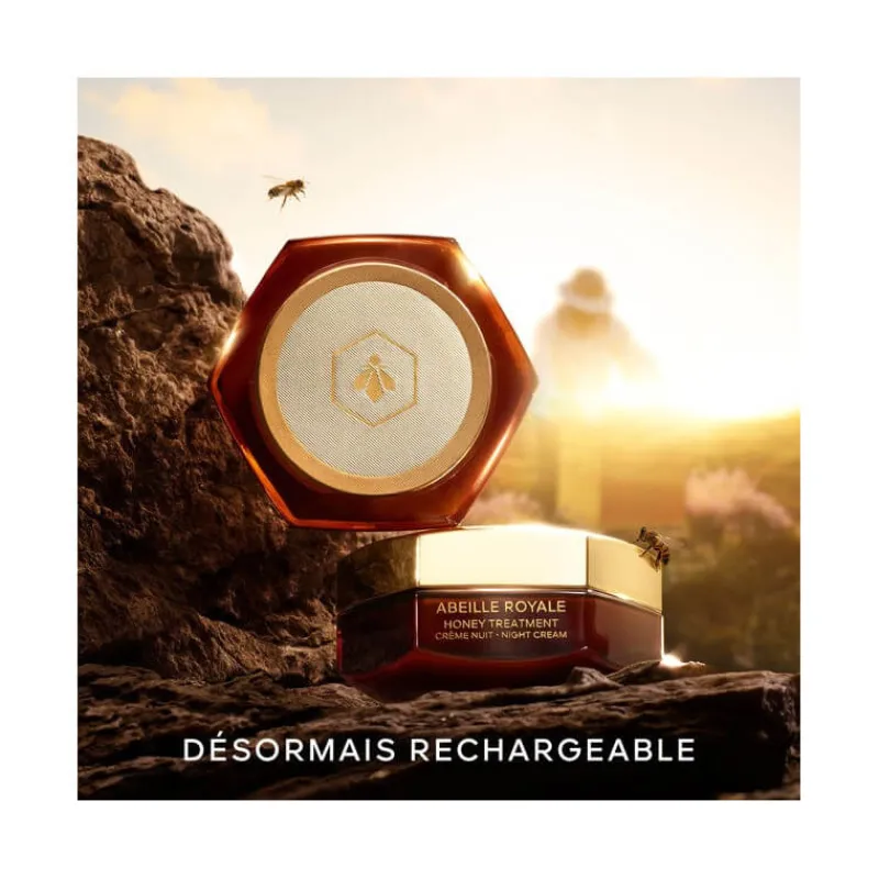 Inspirée des pansements cliniques réparateurs au miel, la Crème Nuit Honey Treatment¹ concentre les produits les plus puissants de l’abeille sélectionnés par la recherche Guerlain pour corriger 4 signes visibles de la perte en collagène liée à l’âge. Les rides s’atténuent, la peau se redensifie et retrouve son rebond. Redessiné, le visage paraît visiblement plus jeune. Elle est fabriquée selon un protocole formulatoire créant une texture comblante à effet « bandage » qui fusionne idéalement avec la peau et imprègne toutes les couches épidermiques d’actifs réparateurs jeunesse.La Crème Nuit Honey Treatment, dans son format 50ml, est rechargeable