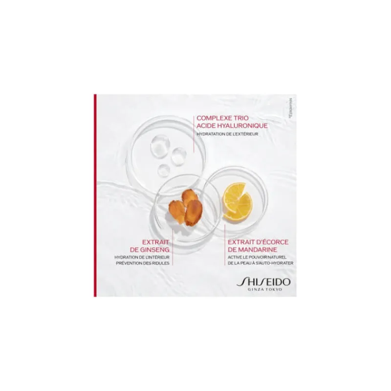 Active le pouvoir d’auto-hydratation de la peau. Prévient l’apparition des ridules grâce à l’Acide Hyaluronique RED de Shiseido.
