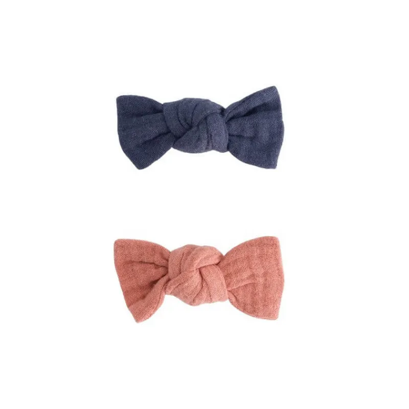 2 jolies barrettes nœud en gaze de coton, couleur terracotta et ardoise.