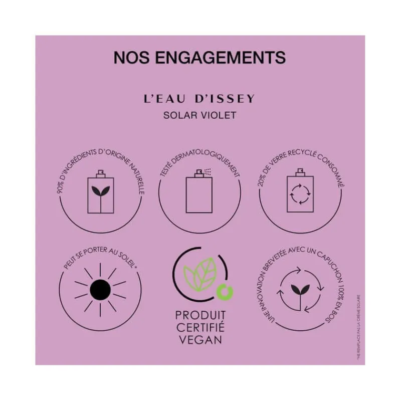 Pour rendre hommage à la nature, ce parfum est composé à 90 % d’ingrédients d’origine naturelle. La violette 100% d’origine naturelle contenue dans L’Eau d’Issey Solar Violet est sourcée de manière responsable en Égypte.