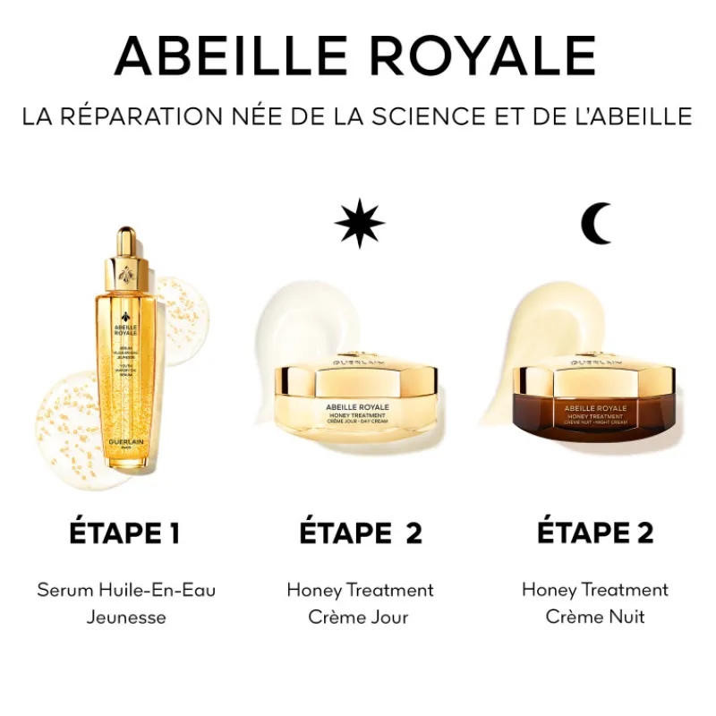 Inspirée des pansements cliniques au miel, les Crèmes Jour et Nuit Honey Treatment⁴ concentre les produits les plus puissants de l’abeille sélectionnés par la recherche Guerlain pour corriger 4 signes visibles de la perte en collagène liée à l’âge. Jour après jour, nuit après nuit, les rides s’atténuent, la fermeté, l’aspect lisse et l’éclat de la peau se restaurent.