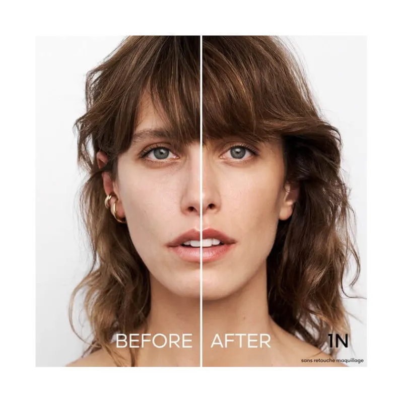 – TAP & STRETCH : une gestuelle d’application sur l’ensemble du visage, réalisée au pinceau¹. Appliquer la texture sur la peau en étirant la matière à l’aide de l’applicateur intégré : sous le coin interne de l’œil, au coin externe en remontant vers la tempe, au niveau de l’aile du nez en remontant vers la joue, puis du centre du front en étirant vers l’extérieur. Tapoter ensuite à l’aide du pinceau puis étirer vers l’extérieur pour un résultat naturel sans démarcation.