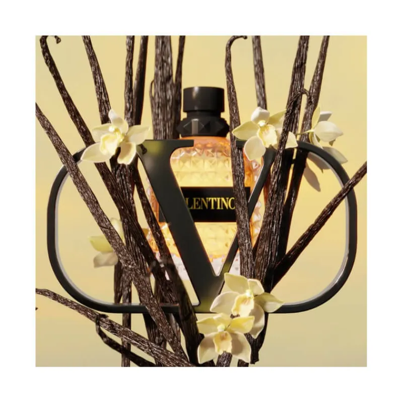 Le flacon reprend l’iconique clou Valentino : inspirée de l’architecture romaine, cette forme pyramidale donne au flacon son côté moderne. Le verre multi-facette est dynamisé par une signature jaune fluo.