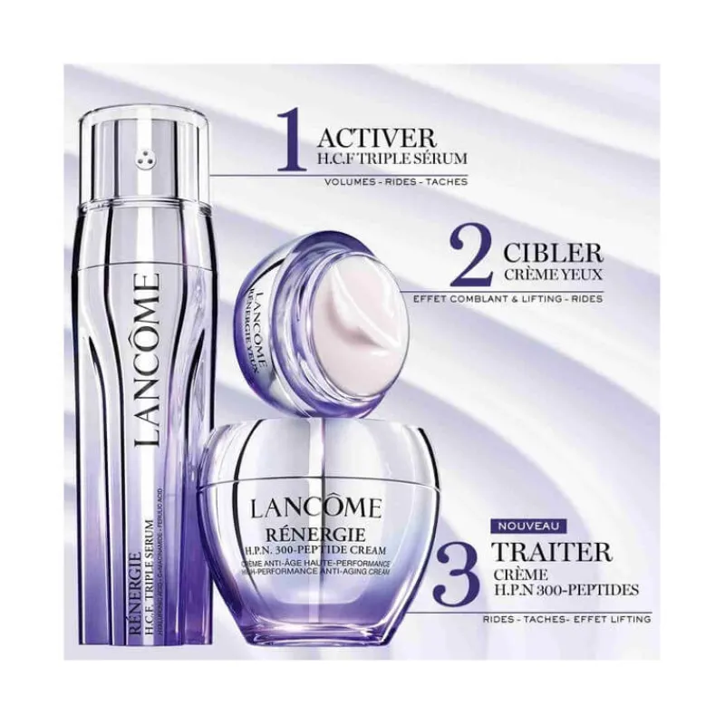 9 FEMMES SUR 10 LE CHOISIRAIENT*, ET VOUS ? • QUELLES ACTIONS ? Pour la 1ère fois, les laboratoires Lancôme réunissent dans une triple dose 3 actifs dermatologiques réputés incompatibles (Acide Hyaluronique, Vitamine C+Niacinamide, Acide Férulique) pour rénover la peau à tous les niveaux : – Niveau 1 : Volumes. En 1 semaine, les contours du visage sont réhaussés, la peau est repulpée, elle paraît plus jeune (1). Tonicité : +37% (4) – Niveau 2 : Rides. En 2 semaines, les rides sont réduites, la peau est comme liftée, le grain de peau est affiné(2). Peau lisse : +30% (3) – Niveau 3 : Taches. En 8 semaines, les taches sont corrigées : elles sont moins visibles, plus petites, moins nombreuses (3). • QU’EST-CE QUI REND CE PRODUIT UNIQUE ? XXX Son packaging ultra innovant, composé de 3 chambres individuelles, sépare les actifs et les protège de l’air, de la lumière et des impuretés pour préserver leur fraîcheur et leur efficacité maximale. À chaque utilisation, les actifs sont mélangés à la concentration optimale grâce au triple embout qui délivre une triple dose haute performance, qui n’agresse pas la peau. 9 femmes sur 10 sont prêtes à utiliser Rénergie H.C.F. Triple Sérum à la place ou en complément de leur sérum favori. La raison ? une efficacité constatée dans le confort d’une crème. • SES INGRÉDIENTS ? 3 actifs dermatologiques anti-âge puissants, pour la 1ère fois dans une triple dose : – Acide Hyaluronique : lisse, repulpe et hydrate la peau. – Vitamine C + Niacinamide : unifie le teint, lutte contre les taches et apaise la peau. – Acide Férulique : améliore la qualité de la peau et la protège contre son vieillissement. Comme tout produit de la gamme Rénergie, H.C.F Triple Sérum contient également des gluco-peptides issus des graines de lin qui ciblent toutes les couches de la peau, pour un effet lifté et rajeuni. • POUR QUI ? – À partir de 30 ans : un sérum 3-en-1 pour les femmes qui cherchent un 1er produit anti-âge concentré en ingrédients actifs, alliant à la fois efficacité et simplicité. – À partir de 45 ans : en 1ère étape de la routine anti-âge, pour les femmes qui cherchent un soin haute performance pour corriger les signes visibles de l’âge Rénergie H.C.F. Triple Sérum a été testé par des dermatologues sur tous les types de peaux, mêmes sensibles. SA TEXTURE ? Chacun de ces 3 actifs dermatologiques est encapsulé dans une texture qui lui est propre pour offrir à ce triple sérum la meilleure des sensorialités, sans irriter ni agresser la peau : – Une crème qui contient l’acide hyaluronique et les gluco-peptides – Une émulsion légère qui contient la vitamine C et la niacinamide – Un gel transparent qui contient l’acide férulique Le résultat ? L’efficacité de 3 sérums sans compromis sur le confort, selon 91% des femmes interrogées*. *test consommateur, 50 femmes, 3 semaines (1)auto-évaluation, 58 femmes, 1 semaine (2)Évaluation clinique, 45 femmes, 2 semaines (3)Évaluation clinique, 45 femmes, 8 semaines (4)Test instrumental, 40 femmes, 1 application